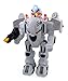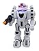This robot holds a cool space blaster which lights up and makes combat sounds. The arms are movable, so you can position it. The robot lights up and marches forward while talking.